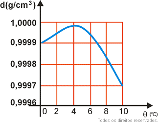 A variação do volume e, consequentemente, a variação da densidade da água com a temperatura estão representadas nos gráficos abaixo.