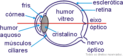 Dentre os elementos assinalados destacam-se a retina, o cristalino e a íris. É na retina que a imagem é formada.